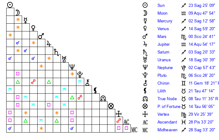 Sun | 23 Sagittarius 25 | 23 Sagittarius 58 | 3 Aquarius 9 |