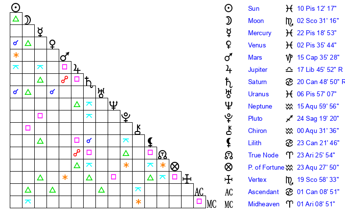 | Neptune | 16 Aquarius 0 | 28 Pisces 53 | 16 Aquarius 40 |