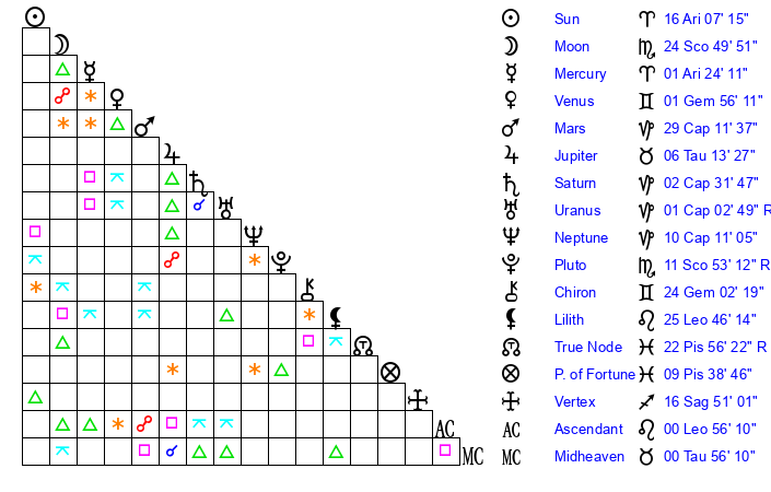 Sun | 16 Aries 7 | 16 Aries 9 | 22 Taurus 10 |