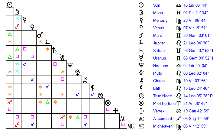 | Neptune | 2 Libra 21 | 0 Aries 17 | 4 Libra 15 |