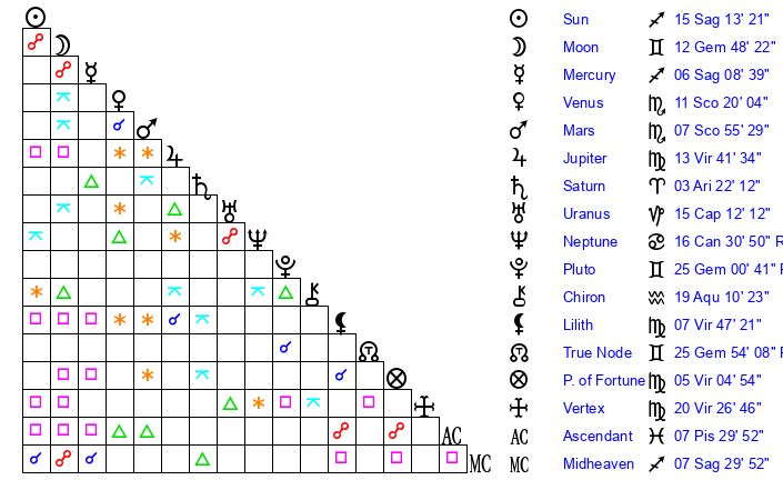 | Pluto | 25 Gemini 0 | 2 Aquarius 3 | 23 Gemini 56 |