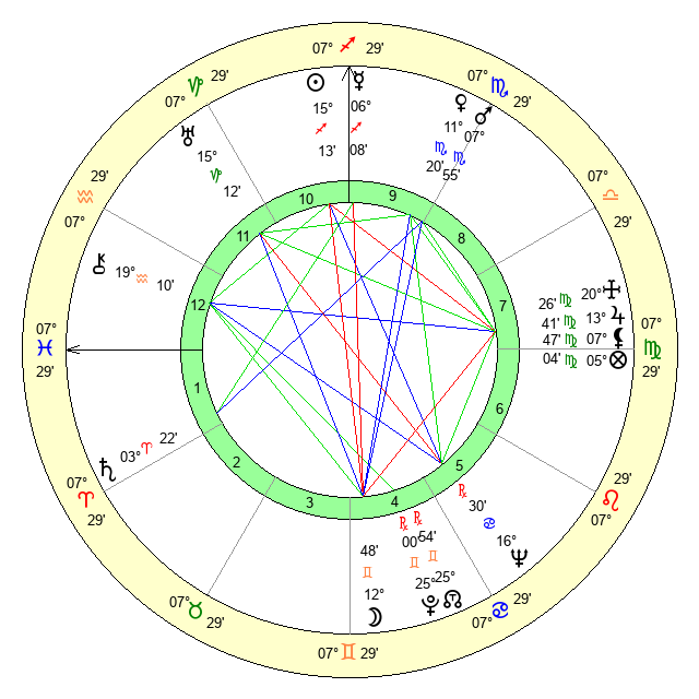 | Moon | 12 Gemini 45 | 23 Cancer 58 | 19 Virgo 47 |
