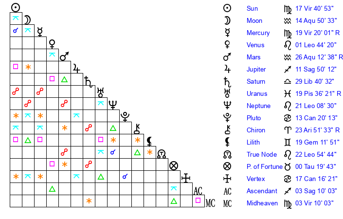 | Sun | 17 Virgo 41 | 18 Virgo 14 | 28 Sagittarius 34 |