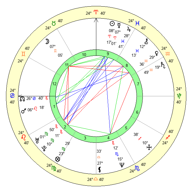| Moon | 7 Gemini 4 | 12 Aries 48 | 14 Virgo 21 |