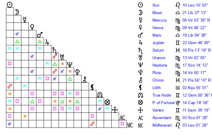 Mercury | 0 Virgo 4 | 7 Leo 45 | 11 Libra 30 |