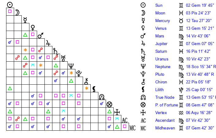 Pluto | 13 Virgo 41 | 3 Aquarius 43 | 14 Virgo 32 |