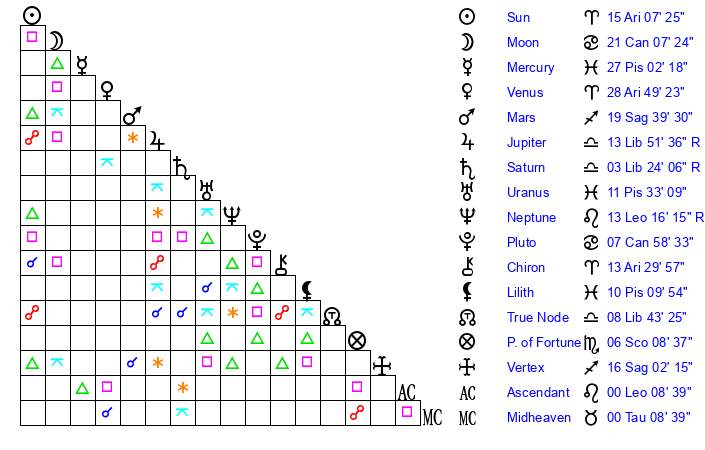 Venus | 28 Aries 50 | 25 Pisces 43 | 2 Virgo 59 |