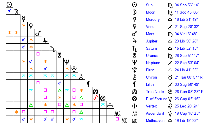 | Sun | 4 Scorpio 56 | 5 Scorpio 16 | 19 Sagittarius 19 |