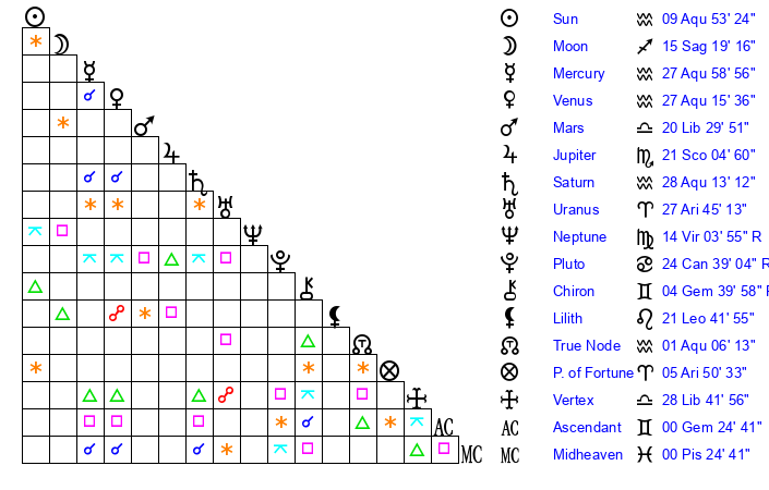 | Moon | 15 Sagittarius 22 | 26 Aquarius 25 | 10 Aries 6 |