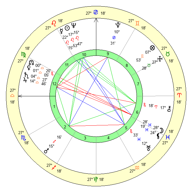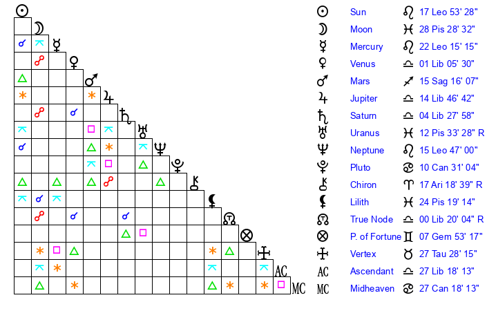 Mercury | 22 Leo 16 | 4 Leo 14 | 21 Scorpio 9 |