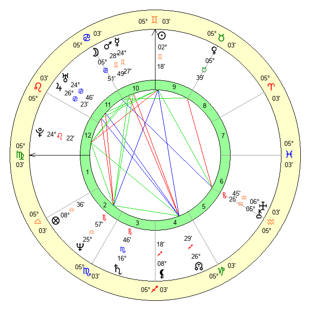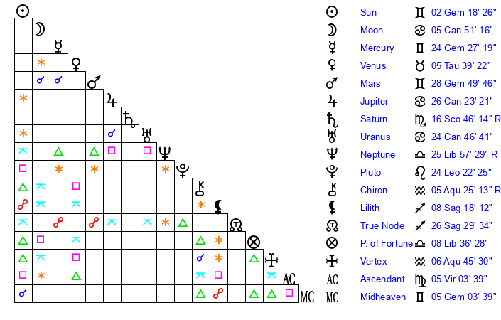 Sun | 2 Gemini 18 | 3 Gemini 20 | 9 Leo 10 |