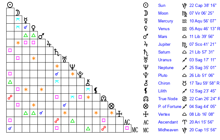 | Mercury | 10 Aquarius 56 | 6 Capricorn 51 | 9 Aquarius 23 |