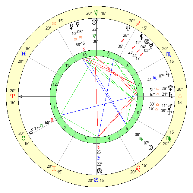 | Moon | 7 Virgo 3 | 13 Cancer 34 | 22 Pisces 0 |
