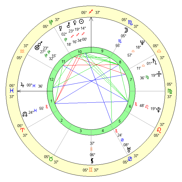 | Moon | 6 Scorpio 4 | 9 Cancer 18 | 4 Leo 39 |