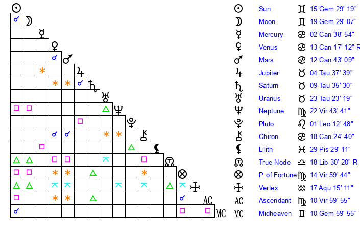 | Sun | 15 Gemini 29 | 15 Gemini 55 | 6 Virgo 49 |
