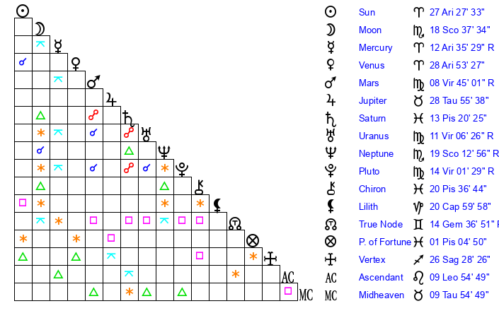 Venus | 28 Aries 54 | 25 Pisces 4 | 12 Cancer 40 |
