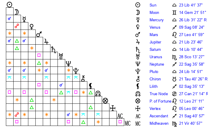 | Sun | 23 Libra 42 | 24 Libra 2 | 7 Sagittarius 52 |