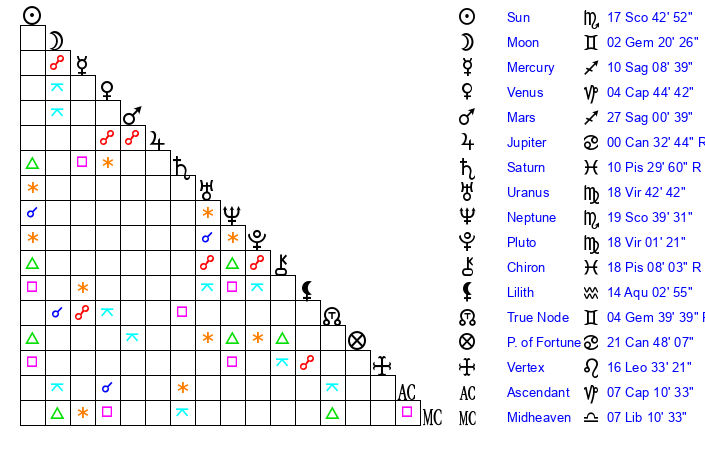 Neptune | 19 Scorpio 40 | 27 Pisces 20 | 21 Scorpio 37 |