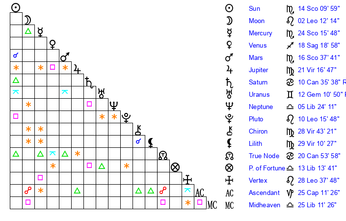 | Neptune | 5 Libra 25 | 29 Pisces 40 | 6 Libra 20 |