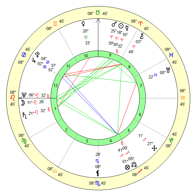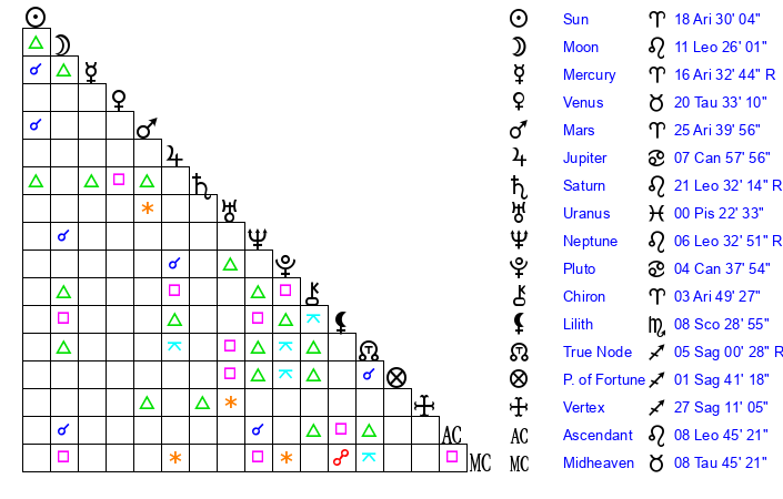 | Neptune | 6 Leo 32 | 0 Aries 22 | 8 Leo 43 |