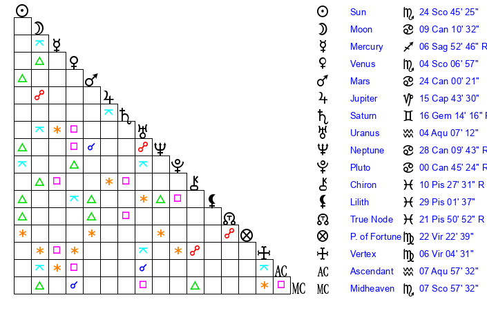 | Sun | 24 Scorpio 45 | 25 Scorpio 50 | 17 Pisces 17 |