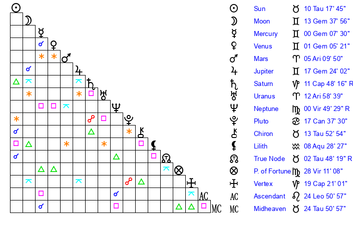 Sun | 10 Taurus 18 | 11 Taurus 17 | 11 Leo 17 |