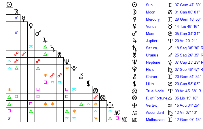 Sun | 7 Gemini 48 | 8 Gemini 34 | 14 Cancer 6 |