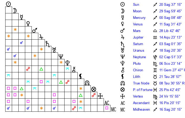 | Saturn | 3 Sagittarius 16 | 25 Pisces 15 | 7 Sagittarius 22 |