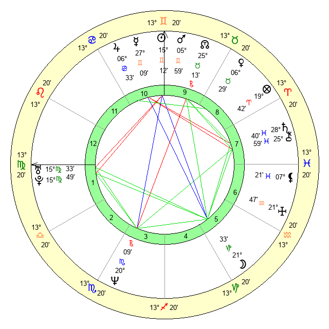 | Sun | 15 Gemini 13 | 15 Gemini 55 | 11 Leo 32 |