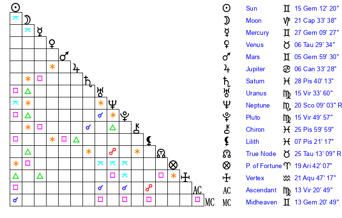 | Pluto | 15 Virgo 50 | 3 Aquarius 34 | 16 Virgo 58 |