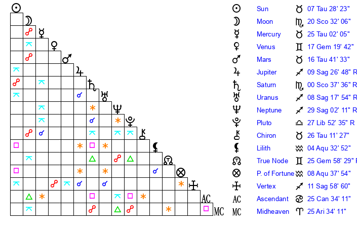 | Moon | 20 Scorpio 26 | 15 Taurus 46 | 23 Taurus 9 |