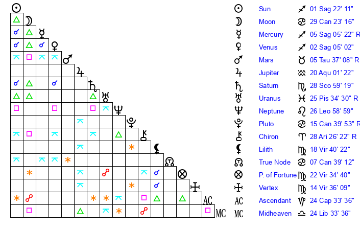 Moon | 29 Cancer 24 | 17 Virgo 35 | 21 Aquarius 15 |