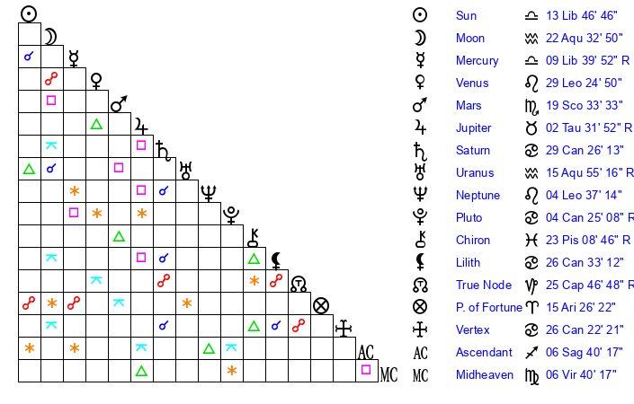 Moon | 22 Aquarius 34 | 5 Sagittarius 3 | 3 Aquarius 55 |