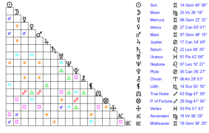 | Sun | 14 Gemini 41 | 16 Gemini 0 | 26 Virgo 25 |