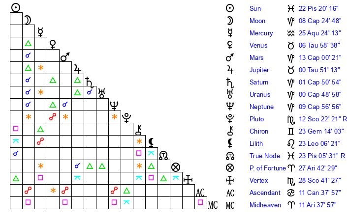 Moon | 8 Capricorn 27 | 4 Virgo 33 | 27 Taurus 39 |