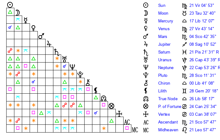 Moon | 23 Taurus 36 | 20 Gemini 50 | 25 Gemini 24 |