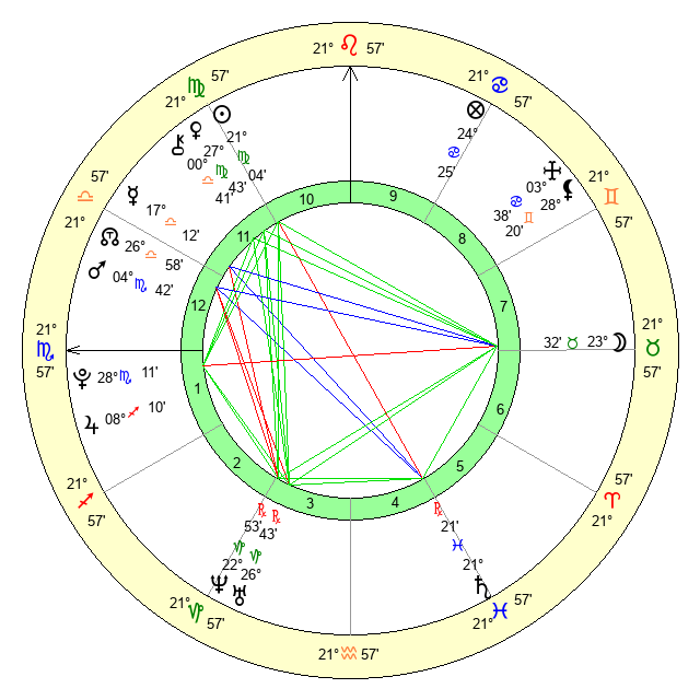 Venus | 27 Virgo 43 | 23 Leo 43 | 5 Scorpio 3 |