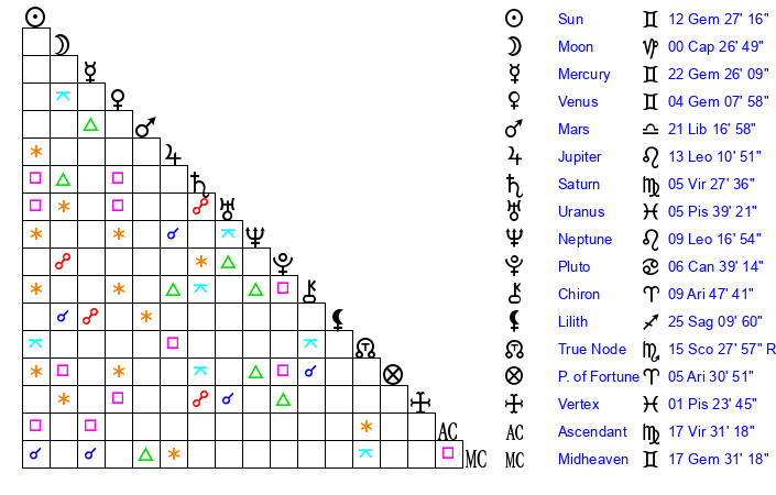 | Mercury | 22 Gemini 26 | 18 Gemini 14 | 29 Virgo 24 |
