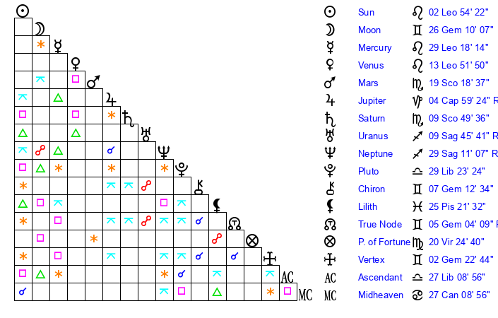 Sun | 2 Leo 55 | 3 Leo 0 | 12 Virgo 20 |