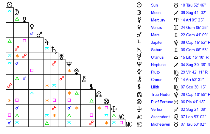Moon | 9 Sagittarius 41 | 28 Gemini 1 | 21 Scorpio 25 |