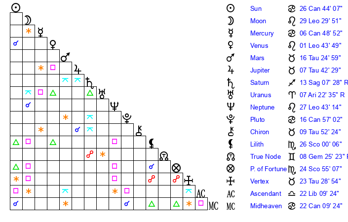| Sun | 26 Cancer 44 | 27 Cancer 16 | 1 Scorpio 3 |