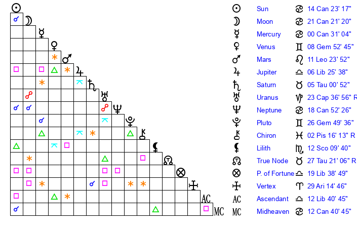 | Neptune | 18 Cancer 53 | 2 Aries 10 | 21 Cancer 34 |