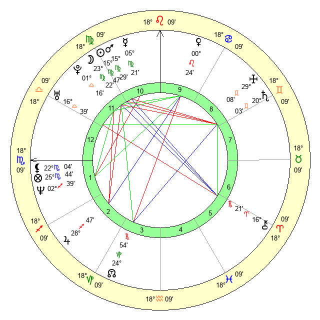 | Moon | 23 Virgo 18 | 13 Scorpio 41 | 21 Leo 20 |