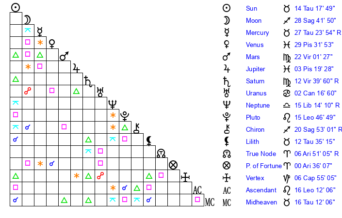 | Moon | 28 Sagittarius 42 | 24 Leo 33 | 16 Virgo 44 |
