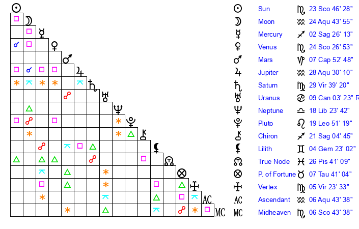 | Sun | 23 Scorpio 46 | 24 Scorpio 35 | 10 Aquarius 0 |