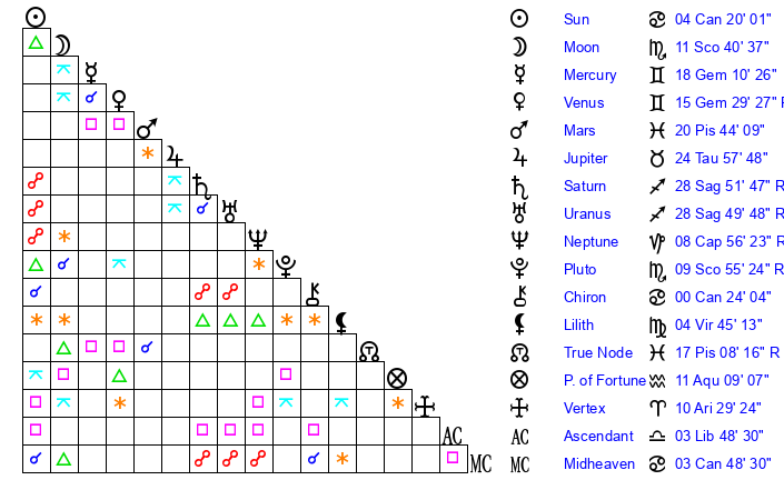 Moon | 11 Scorpio 34 | 8 Cancer 1 | 29 Pisces 20 |