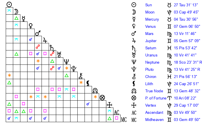 Uranus | 10 Virgo 46 | 27 Taurus 21 | 12 Virgo 17 |
