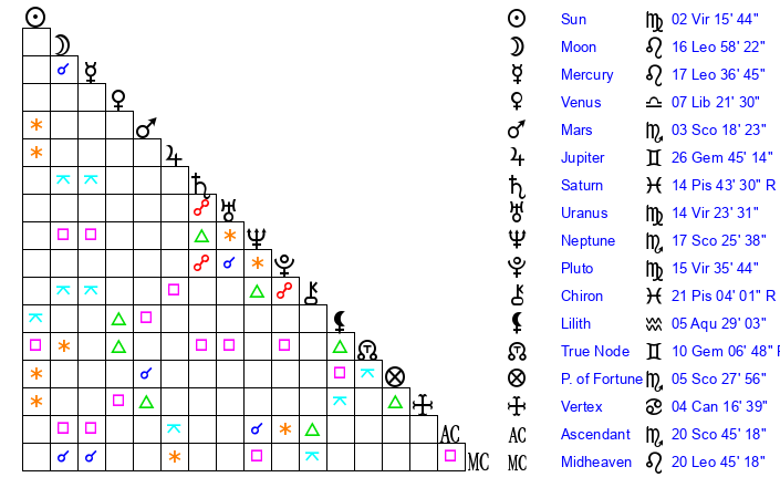 Sun | 2 Virgo 16 | 2 Virgo 45 | 1 Scorpio 5 |