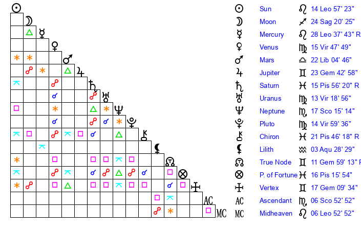 Sun | 14 Leo 58 | 15 Leo 26 | 13 Libra 14 |