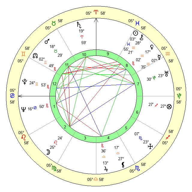 | Moon | 25 Leo 20 | 5 Capricorn 38 | 7 Scorpio 20 |